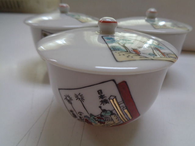 - c272-60 有田焼 蓋付湯飲 金彩 色紙絵 3客セット 茶器
