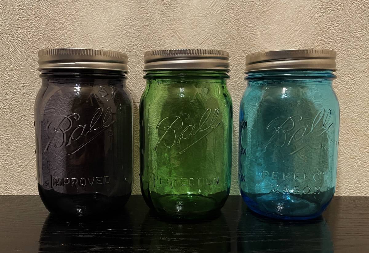 > 希少3色セット100周年記念USA製BallメイソンジャーMASON紫/緑/青レアカラー米製アメリカ製ビンテージ復刻オールド完品デッドストック瓶ビン
