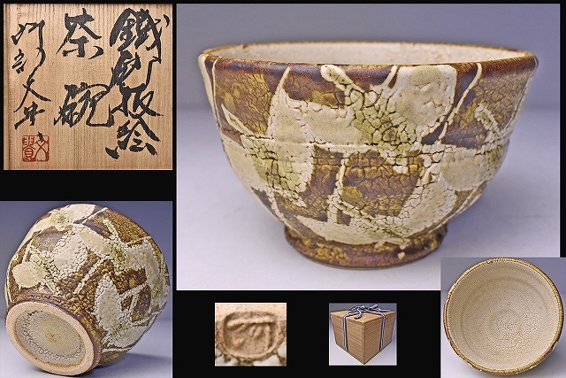 > 阿部文貴 ★ 益子焼 鉄砂 抜絵 茶碗 ★ 共箱 ★ 抜絵の蝶群が雅で梅花皮も見られる景色豊かな逸品 ★ 民芸陶 茶道具 ★