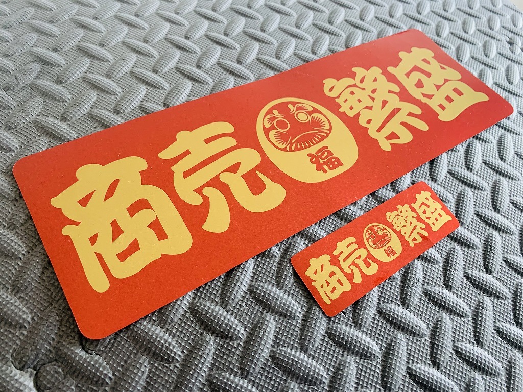 - 送料無料【デコトラ オーダー 防水ステッカー】2枚セット 赤/金文字 商売繁盛 ダルマ 勘亭流 デコトラ スクリーン アンドン