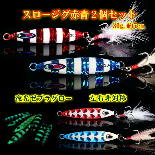 > ■スロージグ赤青2個セット■7cm,30g 夜光ゼブラグロー 左右非対称 不規則フォール 青物/シーバス/タチウオ/根魚など