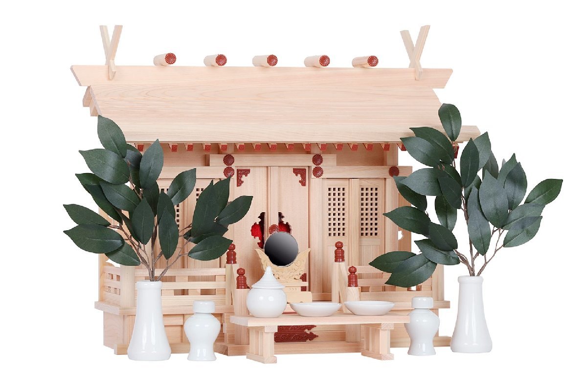 - 神棚 三社 ■ 通し屋根 朱の社 ■■ 明け宮 ■■ 国産 高級神具 神棚セット