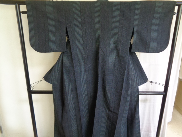 - C415-80 正絹 縮 広衿 縞絣文 裄62センチ 身丈150センチ 昭和レトロ アンティーク
