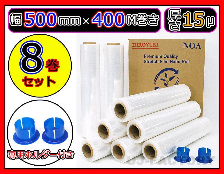 - 【HIROYUKI】★梱包用・ストレッチフィルム 8本セット/ホルダー付(巾:500mm×長さ:400m 15μ紙管内径60mm★高強度/危険な荷崩れ防止!