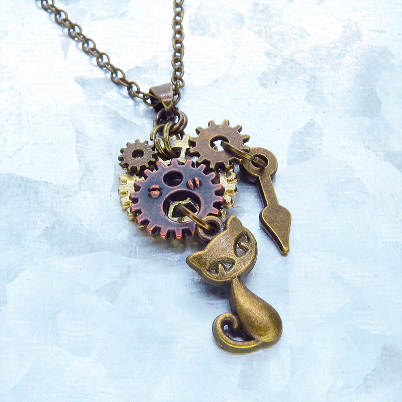 - アンティークゴールド スチームパンク風 猫と歯車のコンパクトなペンダントネックレス 長さ調整可 アジャスター可