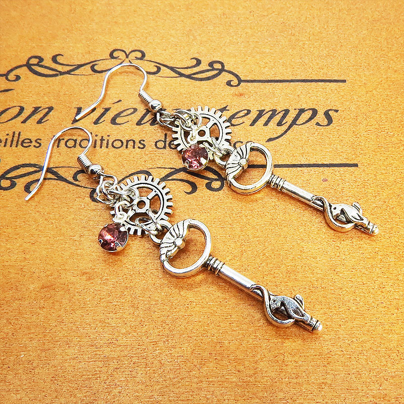 > アンティークシルバー 鍵に座る猫と歯車を組合せたスチームパンク風のスリムなピアス ラインストーン(ヴァイオレット)