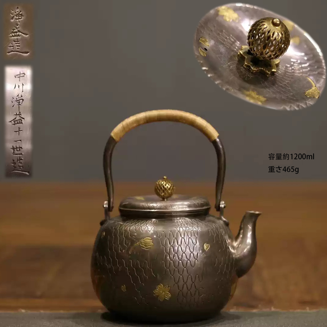 > 古銀 茶壺 浄益 造 純銀製塗金桜紋提梁壺 銀瓶 煎茶 湯沸 急須 茶道具 南鐐 金工 茶器 時代物 LT-02114