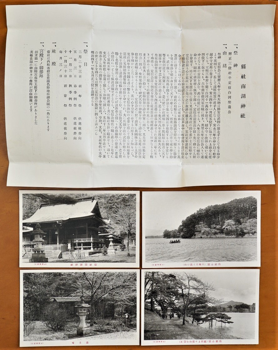 - 県社南湖神社絵葉書 4枚 福島県白河町鎮座 紙袋付 検:祭神松平定信 福島県白河町観光歴史 南湖公園 共楽亭 鏡の山 松風亭蘿月庵 渋沢栄一