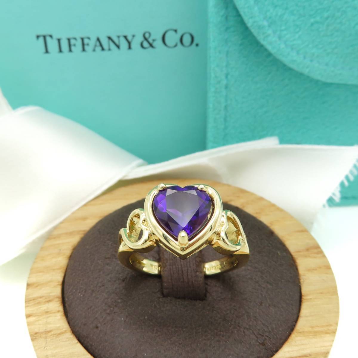> 未使用 希少 Tiffany&Co. ティファニー ハート 大粒 アメジスト イエロー ゴールド リング 11号 指輪 750 K18 パープル AA243