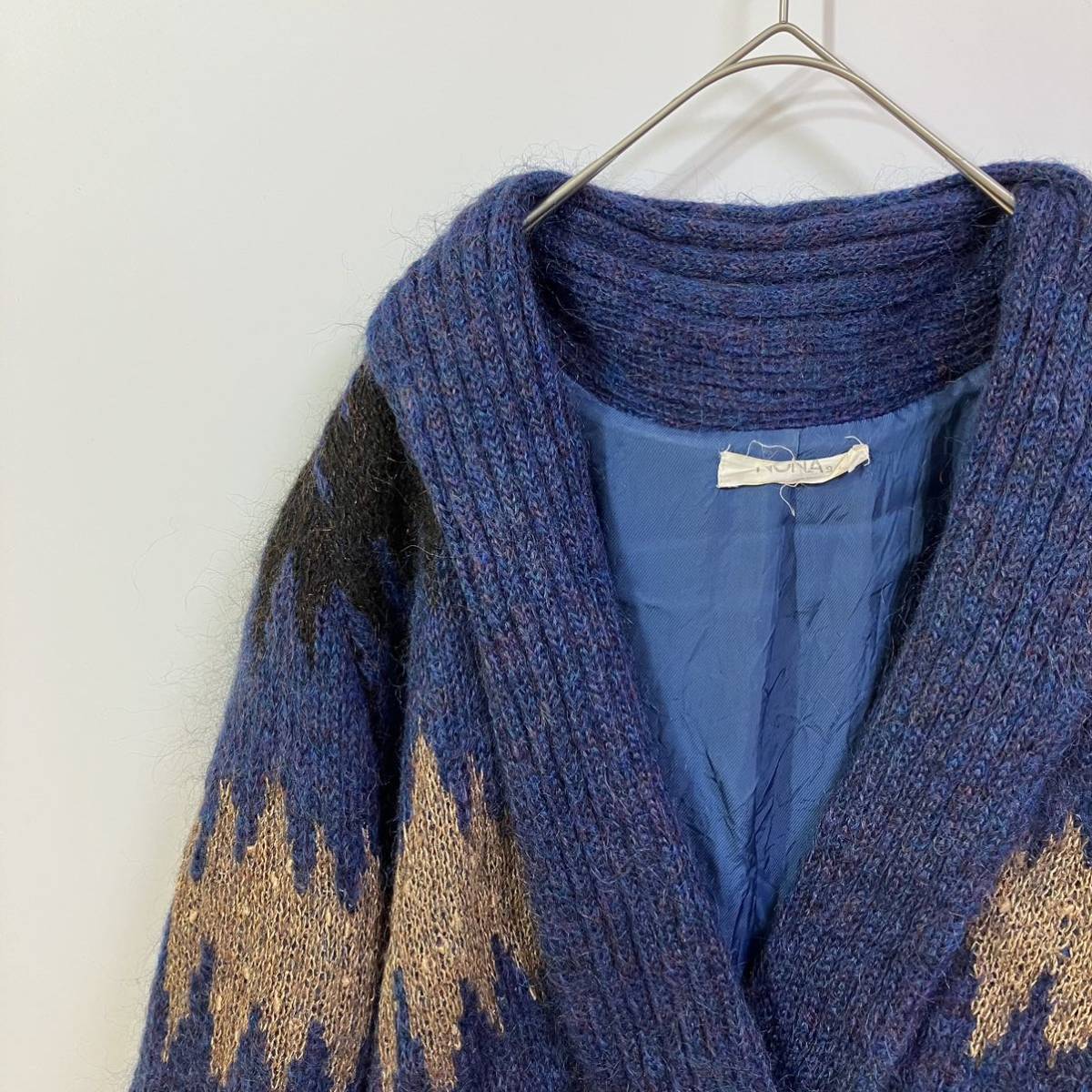 > 古着 ヴィンテージ ギザギザ レトロ ボタン ショールカラー ラグラン ローゲージ ウール混 裏地キュプラ 高級 肩パッド入り カーディガン