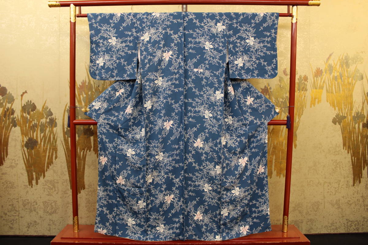 > きもの今昔4874 小紋のきもの 正絹一越地広衿袷手縫い仕立て 浅葱色地カトレアの柄 身丈153cm