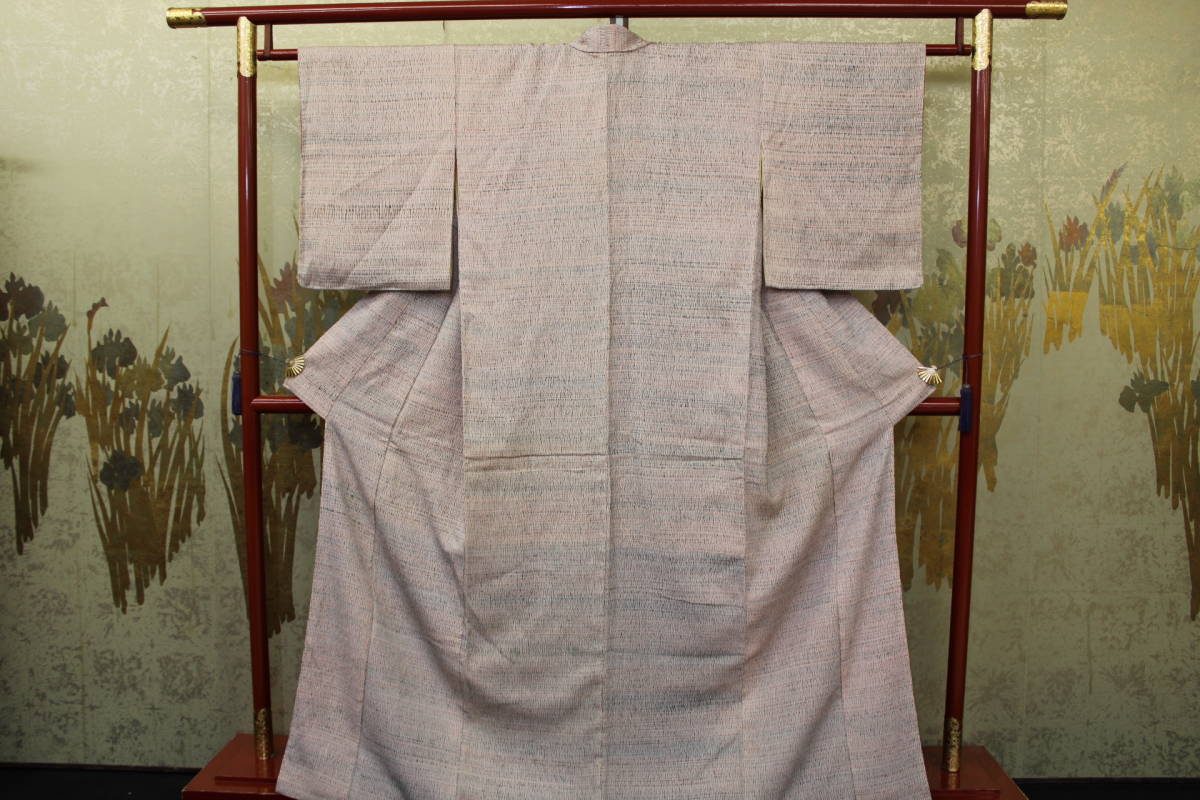 > きもの今昔4912 小紋のきもの 正絹縦しぼの膨れ織 淡い膚色地に濁りブルーの横刷毛染 身丈162㎝