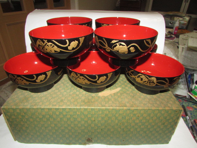 - (酒屋・蔵出し)(昭和レトロなお椀・貝に松竹梅・宝尽くし模様・10客)箱入り未使用・普段使いに