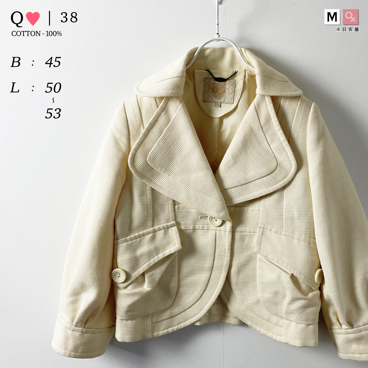 > Q キュー バルーンスリーブ 変形 テーラード ジャケット アイボリー ベージュ オフホワイト Aライン 春 秋 カジュアル 綿 100% 9号 38