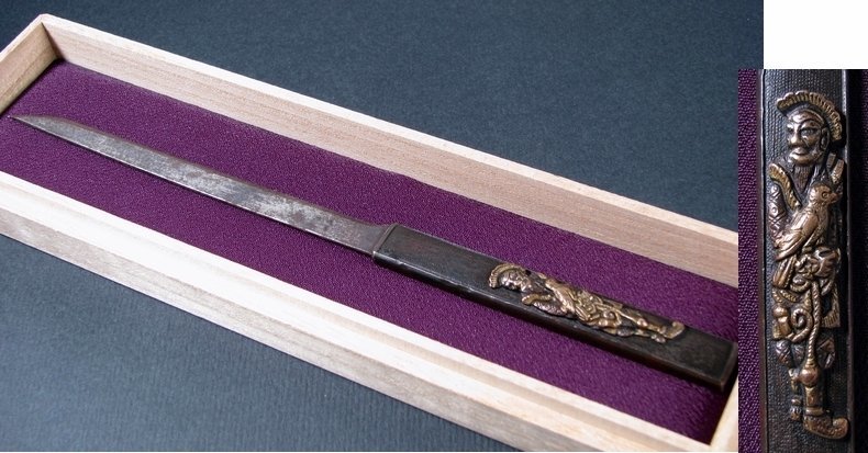 - 時代武具 赤銅魚々子地 小柄 小刀 鳥を持つ南蛮人の図 桐箱付 江戸時代/23d018