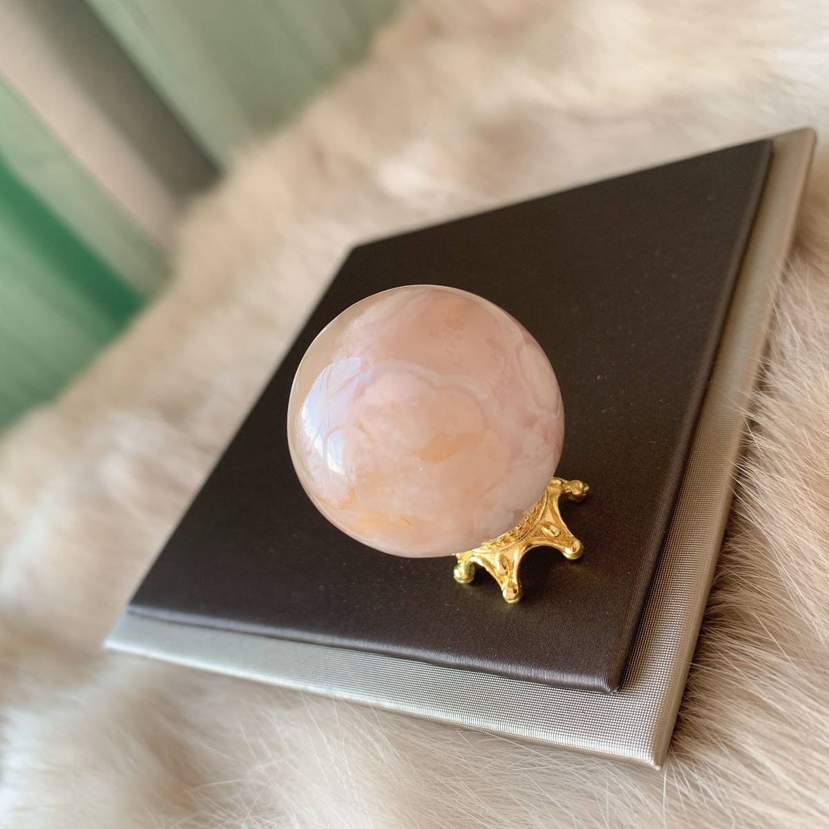 - 訳あり◇桜瑪瑙(チェリーブロッサムアゲート)◇丸玉◇天然石◇パワーストーン◇置き台付き◇置物◇プレゼントにも 018J4104