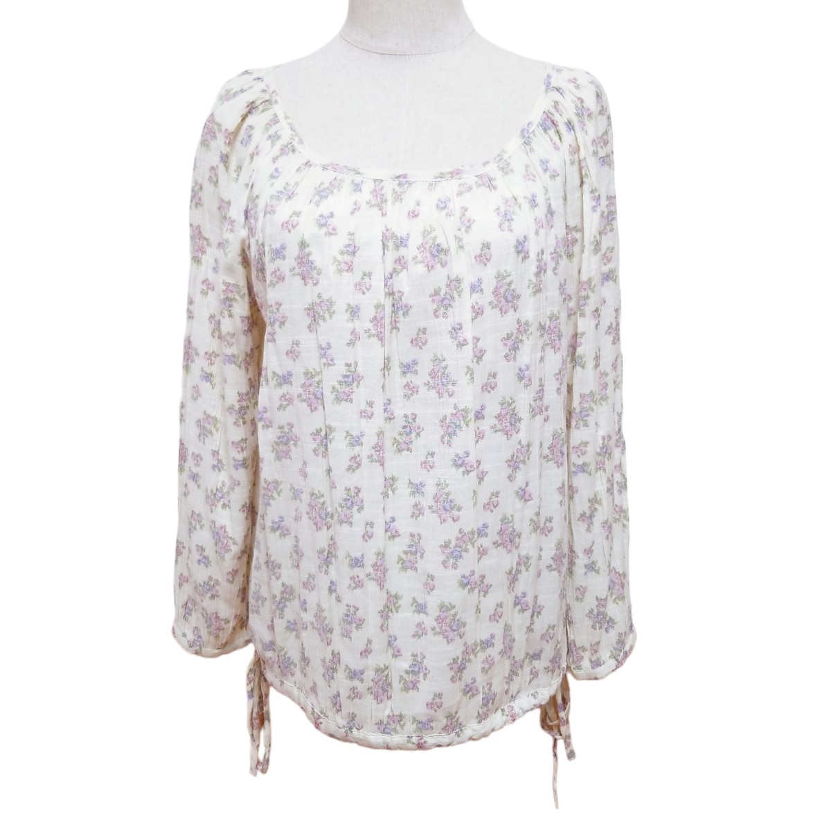 > Y238 麻調 ギャザーブラウス トップス 長袖 ドローストリング レディース M オフホワイト 生成 花柄 総柄 薄手 ゆったり 可愛い ナチュラル