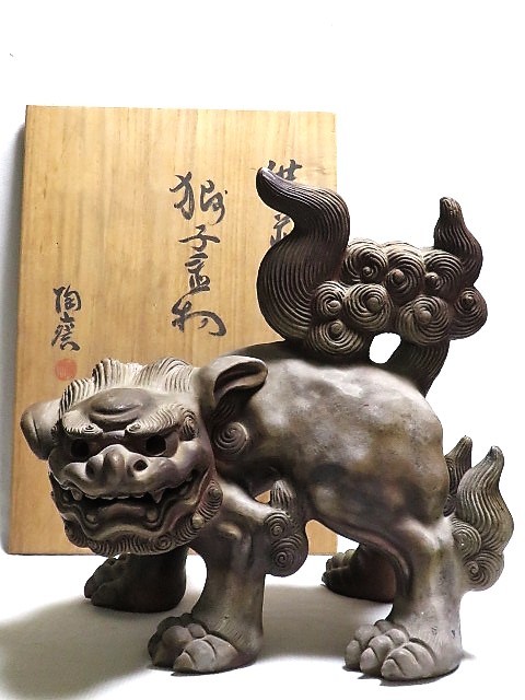 - 備前獅子置物 備前焼 共箱 陶斎 約36.5cm×約26.5cm 高さ約37.5cm 飾り物