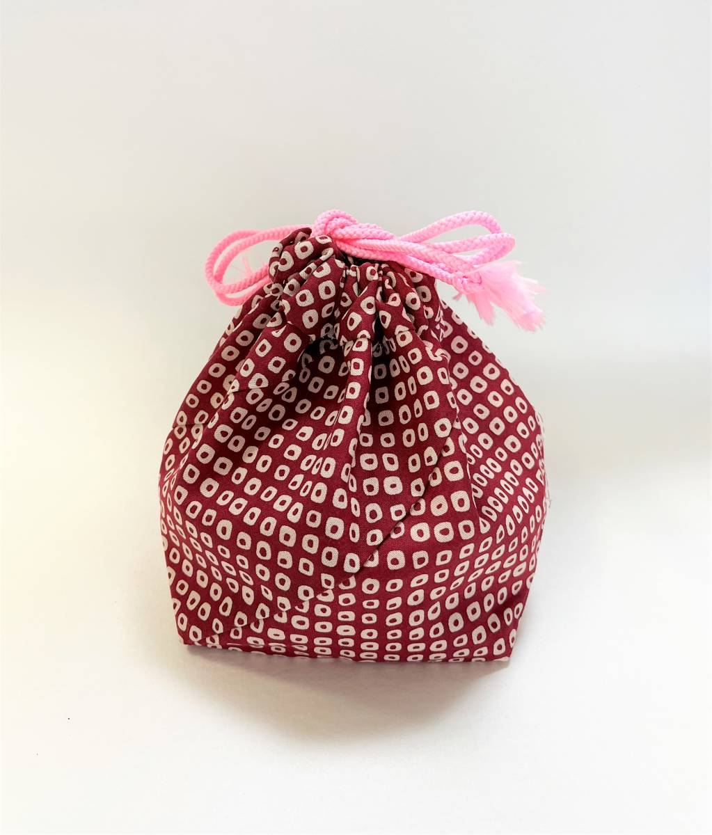 - 花とら●リサイクル巾着袋 ハンドメイド 浴衣 カジュアル 小物入れ 疋田 小豆色 230410