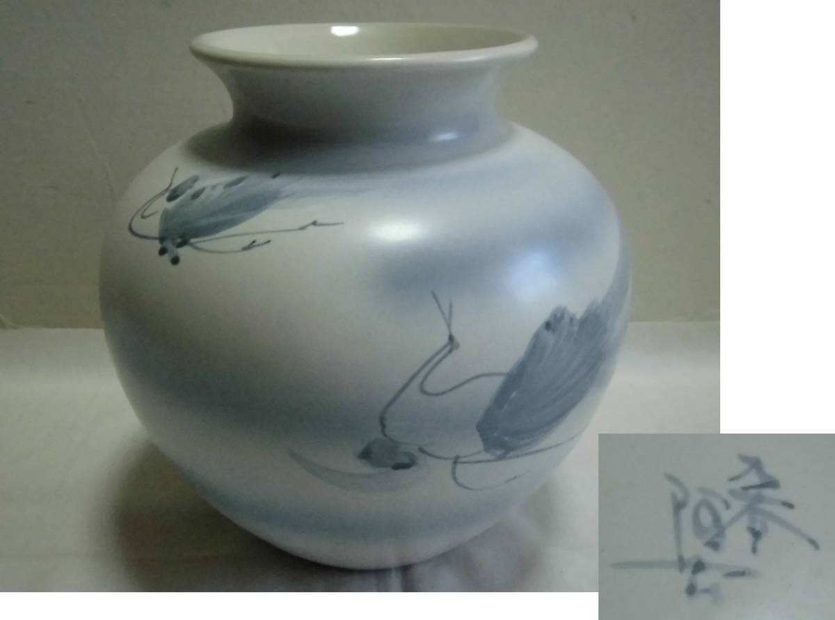 > 花瓶 在銘 窯印有り 壺形 夫婦鶴柄 染付 壷 飾り花瓶 置物 フラワーベース 花器 華道 花入 陶器 工芸品 レトロ
