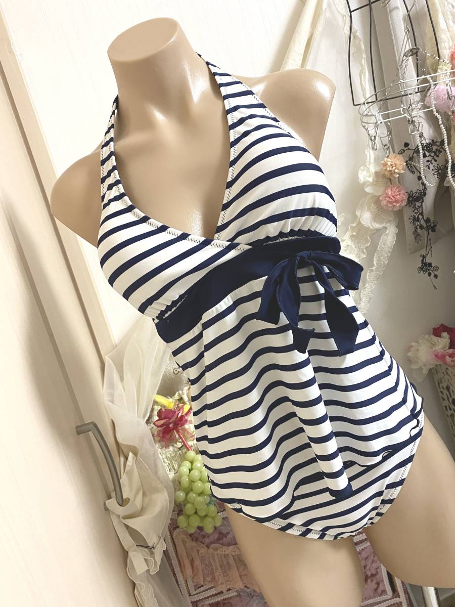 - ●レディス水着9M●東京印◆ホルターネック水着*タンキニ水着:紺x白