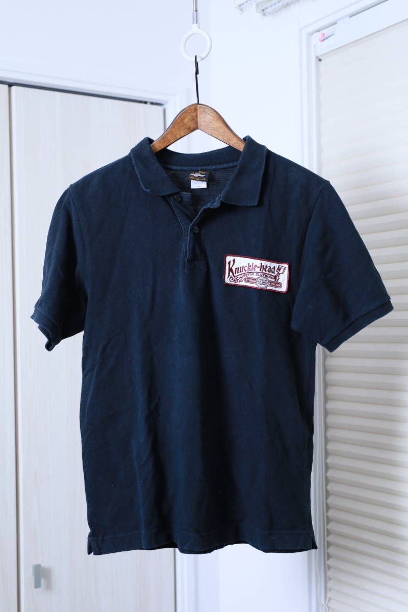 > ★KNUCKLE HEAD ナックルヘッド ワッペンプリント加工半袖ポロシャツ 古着ユーズド男性メンズS黒ブラックトップス服アメカジ