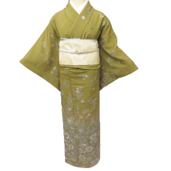 - ★きもの北條★ 特選 花模様 蘇州刺繍 落ち着きある彩り 桑染色 薄茶色 着物 訪問着 A757-13 M【中古】