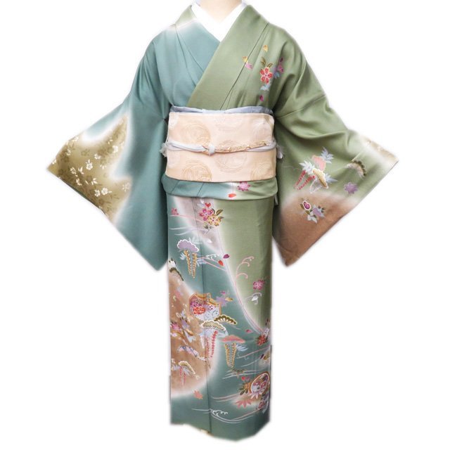 > 訪問着 着物 中古 正絹 袷 フォーマル 植物文様 金駒刺繍 流水 柳茶色 青竹色 多色 身丈165cm 裄69cm L トール きもの北條 A859-3