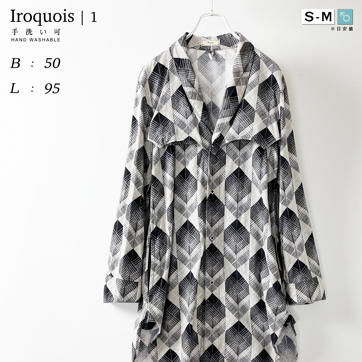 > Iroquois オンブレ チェック 柄 幾何学 ロング シャツ コート 黒 ブラック 総柄 グレー ネルシャツ モノトーン 綿 100% コットン イロコイ
