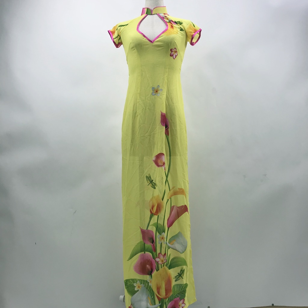 - 半袖 チャイナ風ドレス サイドスリット 花柄 イエロー サイズM レディース