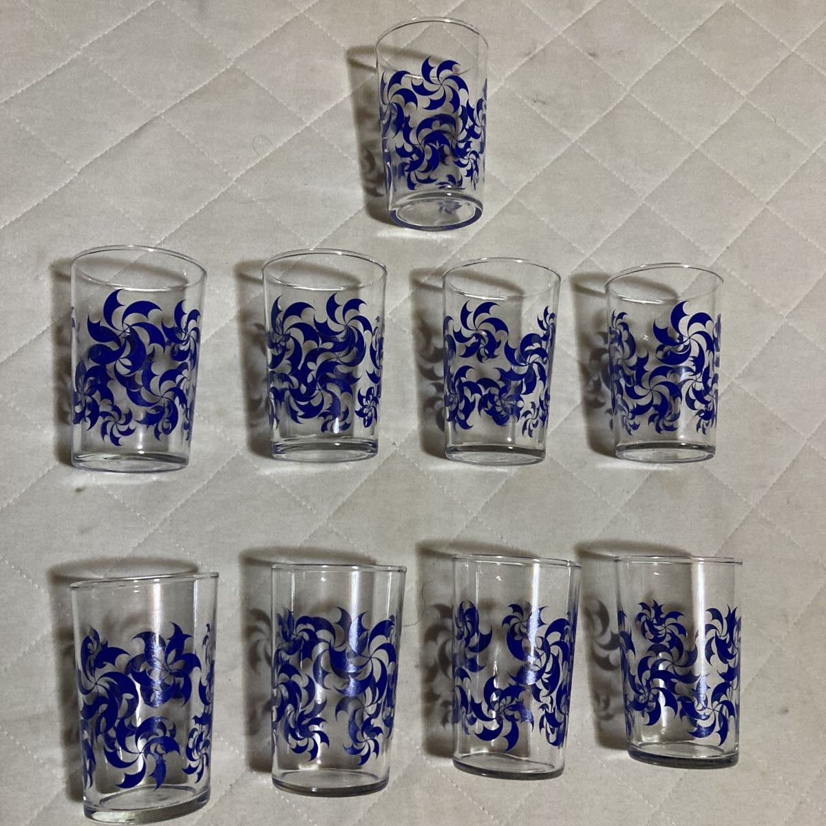 > 昭和レトロ.タンブラーグラス .模様入り色付きガラス.9個.完品.グラス.底に模様.刻印有り.底の太さ.約5cm.高さ.約9.3cm.口の 太さ.約6.1cm