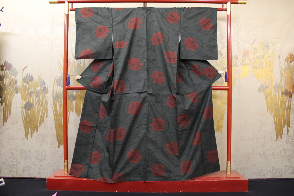 > きもの今昔5261 本場大島紬 泥染七マルキ 草木グリーン色につる草に花柄 軽い箪笥仕舞い込みカビ有り 身丈154cm