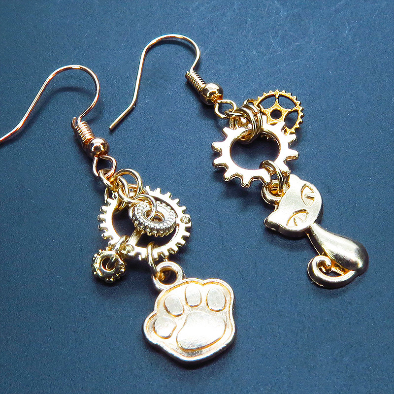 - マットゴールド 猫と肉球に歯車を組合せたスチームパンク風アシンメトリーピアス サージカル可