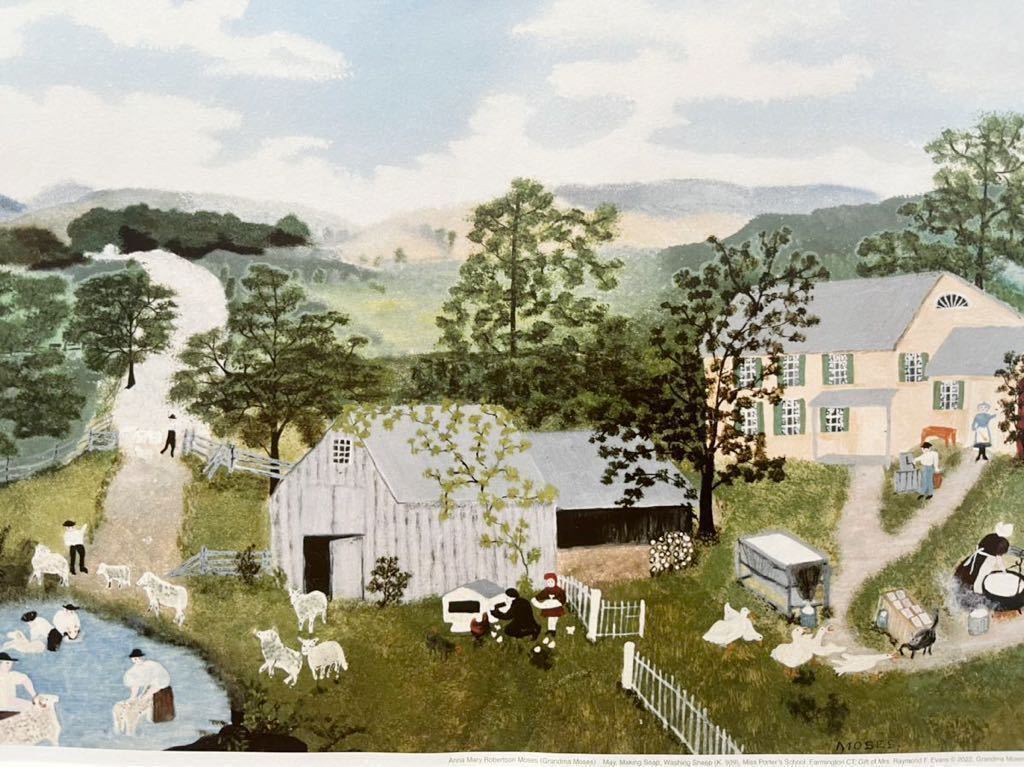 - 【グランマ・モーゼス】「5月:せっけん作り、羊を洗う」印刷物 絵柄20種 額 絵 木製額装44.1×33.8cm 絵柄違い有