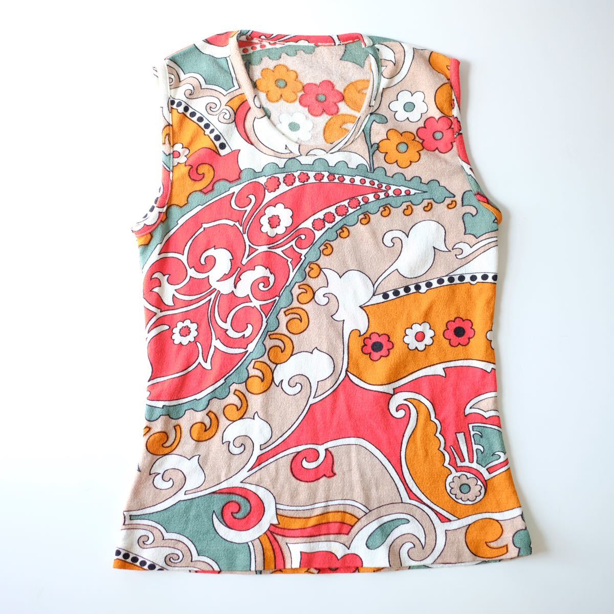 - 【1970〜80s】ビンテージ 総柄デザイン ノースリーブTシャツ タンクトップ ヒッピー サイケデリック モダン カラフル アート