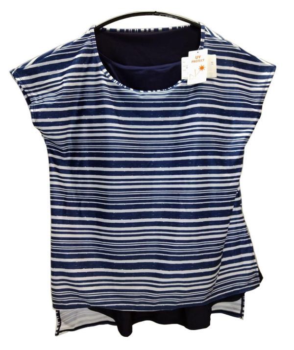 > SS2408-2◇ 新品 ラッシュガード 水着 フェイクレイヤード UVカット加工 カップ付 ボーダー柄 裾サイドスリット 10Lサイズ ネイビー