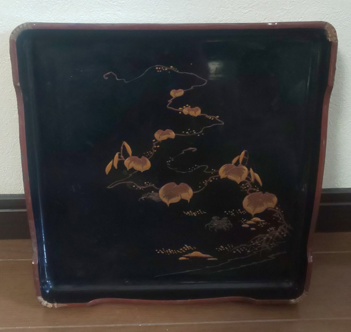 - 蔵出し おぼん トレー 蟹 植物 黒塗り インテリアレトロ 古いモノです