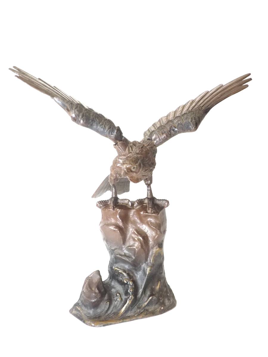 > 昭和ビンテージ 金属工芸品 秀峰作 鋳物オブジェ 岩上の鷹置物 「波の打ちつける岩場に留まる鷹」 岩の背面に「秀峰」の文字あり TCU507