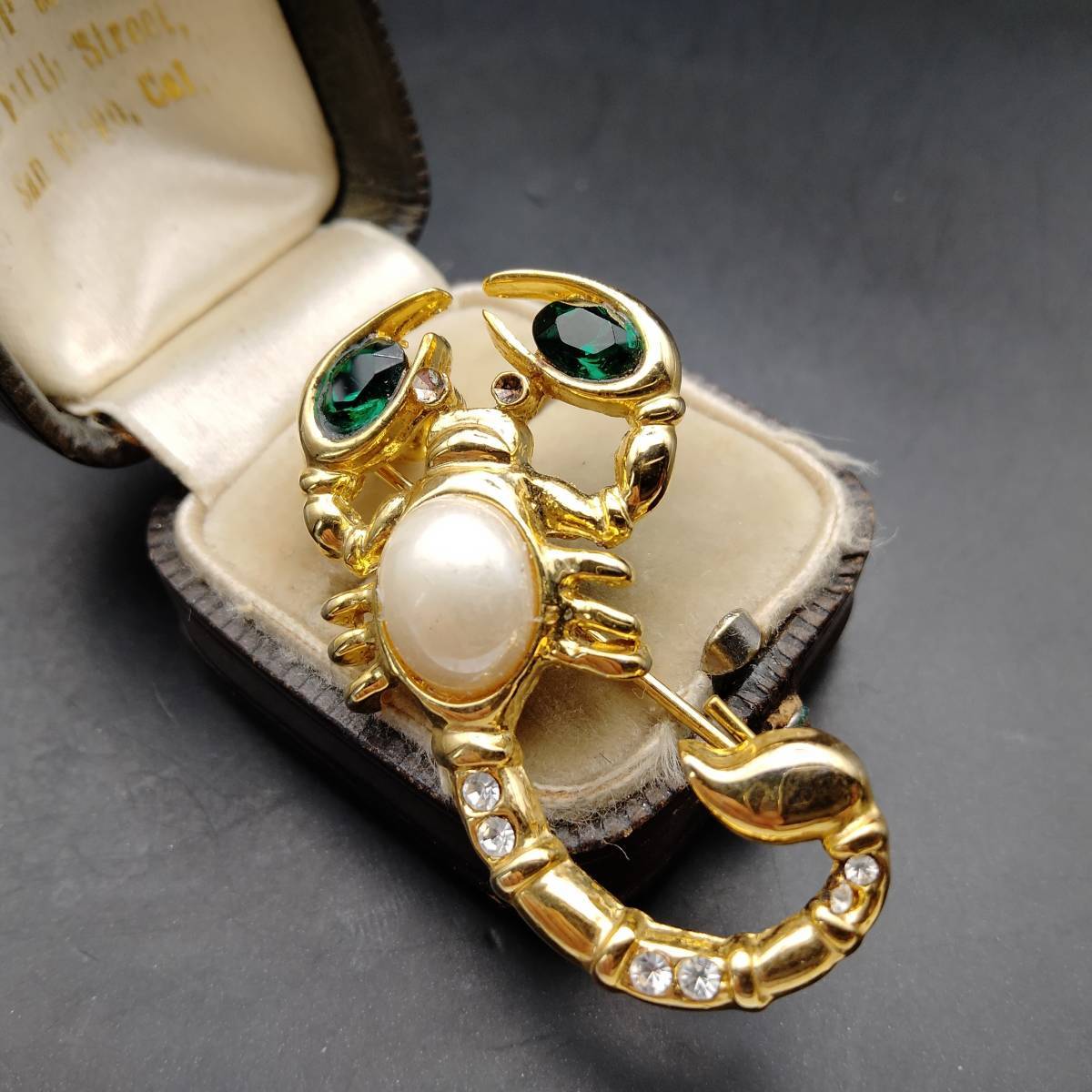 > サソリ モチーフ ホワイト カボション グリーン クリア ストーン ビンテージ ブローチ 昭和レトロ コスチューム ジュエリー 輸入 8S-E