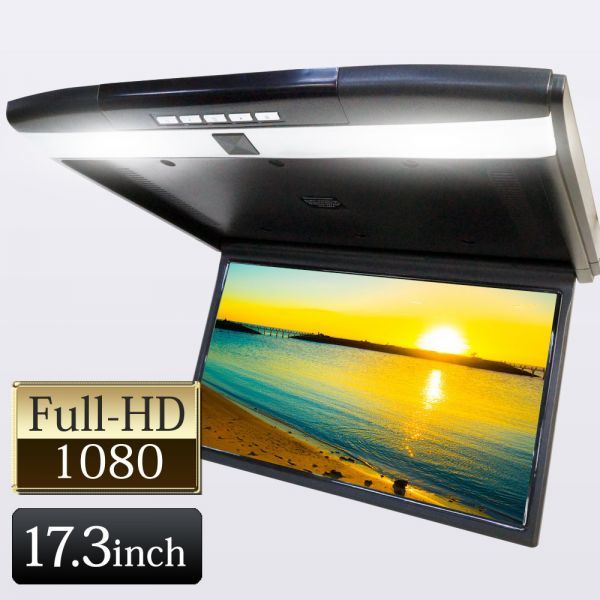 > 17.3インチ フリップダウンモニター スピーカー LEDルームランプ 内蔵 miniHDMI ポート搭載 microSDカード USB IR(赤外線)対応 120度展開