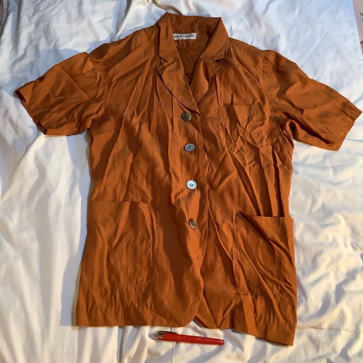 > 半袖ブラウス オーバーブラウス M身幅55着丈75cm 500円超10%オマケ アセ50レヨ50% ポケ2 朱色 裾補修 日本 最後別出ズボン売却済