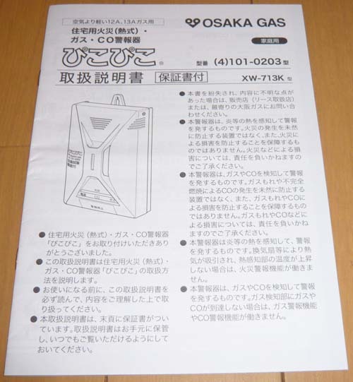 - ◆取扱説明書のみ◆OSAKA GAS・大阪ガス☆ぴこぴこ◆住宅用火災。ガス・CO警報器【美品】 ☆送料140円
