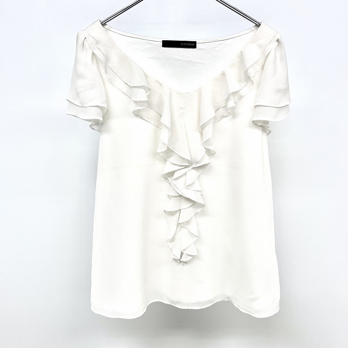 - 22 OCTOBRE フロントシフォンカットソー 袖シフォン Vネック ラッフル 無地 レーヨン×綿×EVOH 2 ヘザーオフホワイト 杢白系 レディース
