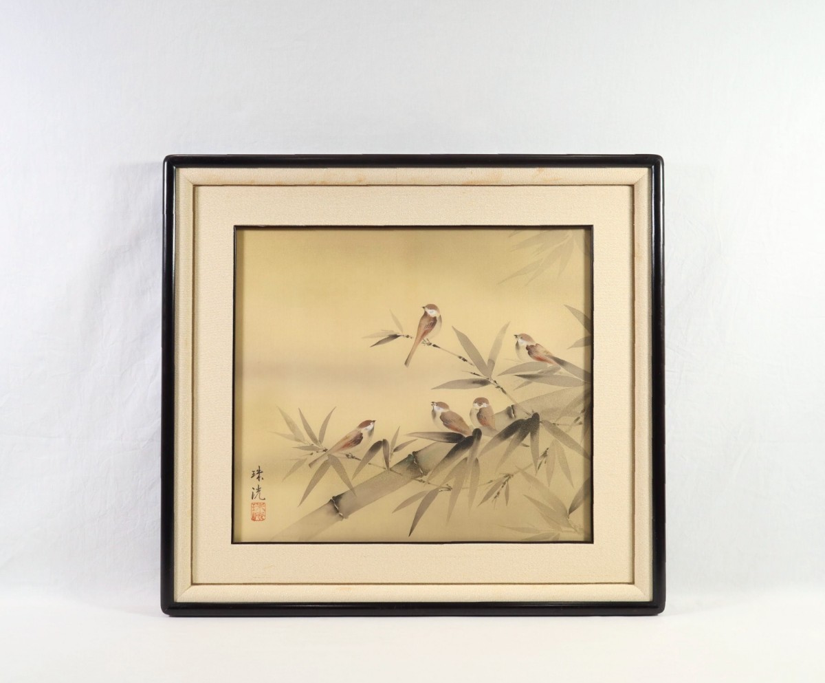 > 真作 岡本珠洸 日本画「竹に雀」画寸 55cm×52cm 京都府出身 京日画協主宰 橋本関雪に師事 鋭い観察力と表現力の豊かさを感じる 7876