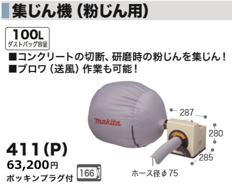 マキタ 集塵機(粉じん用) 411(P) 定価63,200円(税別) ■コンクリートの切断、研磨時の粉じんを集じん ■ブロワ(送風)作業も可能 ■主要機能 集じん容量100L 電源単相100v 電流11A 消費電力 1050w本機寸法(長さx幅x高さmm)=285 x 287 x 280、質量9.3kg コード5m ■付属品 ホースコンプリート(2.5m/口元取付金具付) ダストバック