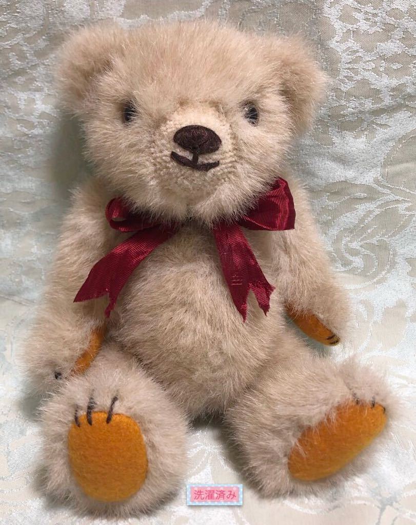 > かわいいベージュのテディベア 首にエンジのリボン くま 手足首にジョイント クマ ぬいぐるみ 25㎝ 熊 レトロ メルヘン ファンシー 洗濯済