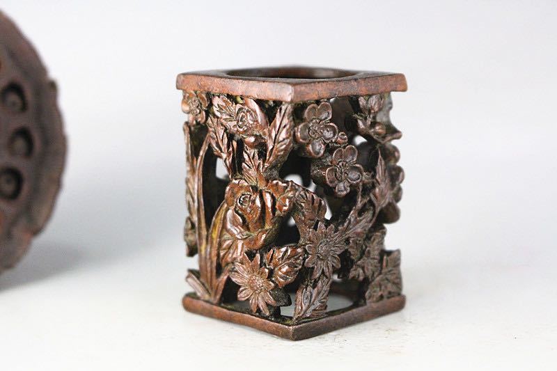 - 極美古銅煎茶道具 質感 細工梅花盖置 透かし 通し 一通し百通る 古玩 置物