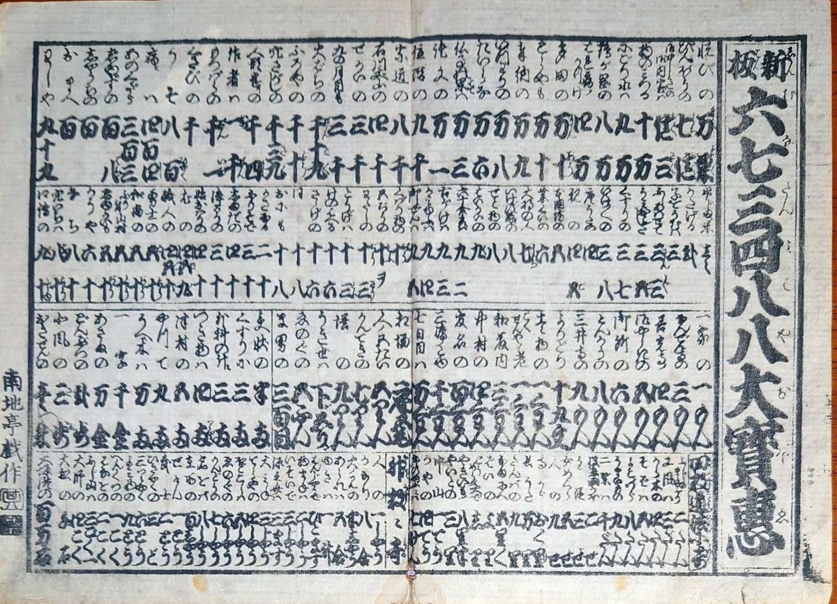 - f230900705〇一枚刷り 浪花みやげ第2編第2集 新板六七三四八八大宝恵 ことば遊び しゃれ なぞ 判じ絵 見立番付 天保年間 塩屋喜兵衛板