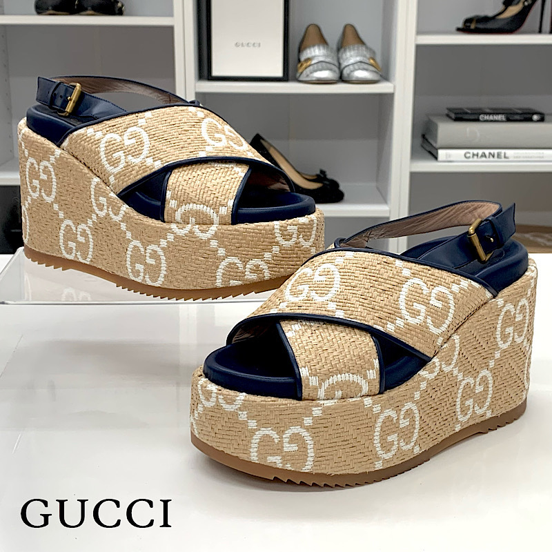 - 7948 グッチ レザー ストロー GG ウェッジソール 厚底 サンダル バイカラー