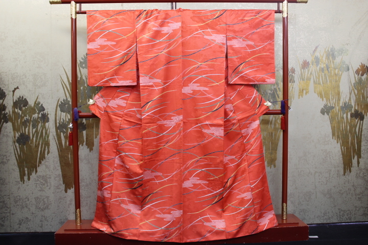 > きもの今昔5815 合繊のきもの 広衿袷仕立て ポリエステル100%綸子地レンガ赤色にすすき野の柄 身丈158cm